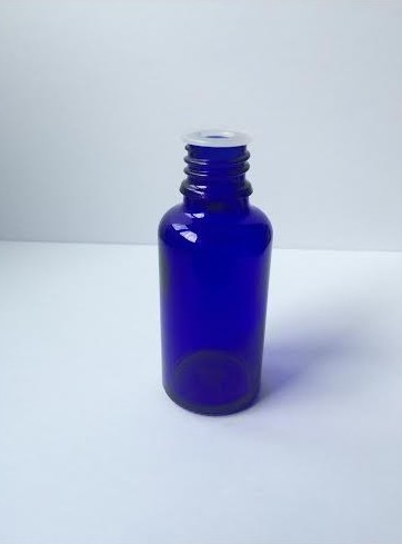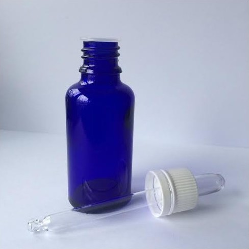 Piccola boccetta di vetro scuro o PET, con pipetta contagocce in vetro o plastica.